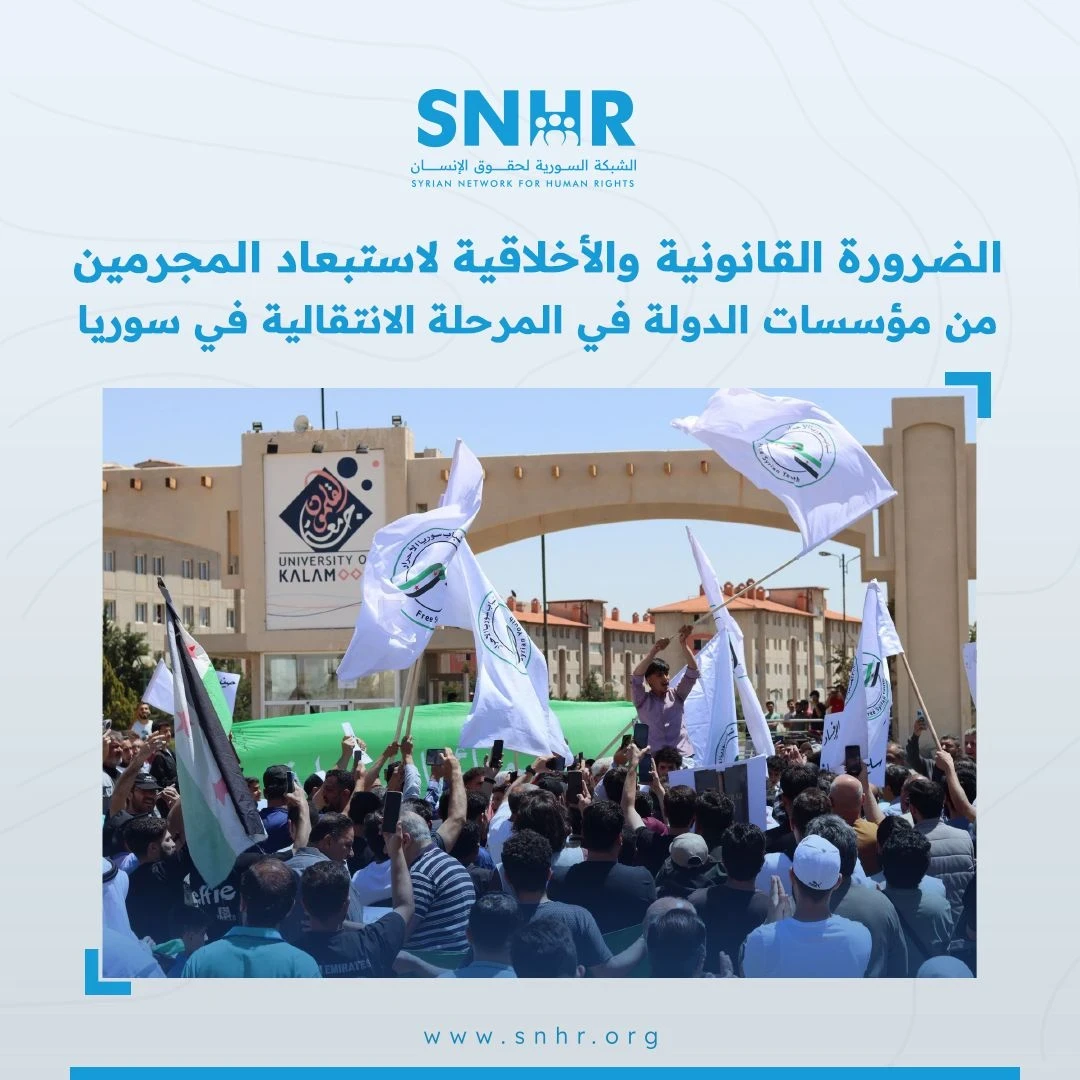 أصدرت الشَّبكة السورية لحقوق الإنسان تقريراً تحليلياً بعنوان "الضرورة القانونية والأخلاقية لاستبعاد المجرمين من مؤسسات الدولة في المرحلة الانتقالية في سوريا"، مؤكدة أن عملية التطهير الإداري ليست خياراً سياسياً، بل حاجة ملحة لإعادة تأسيس عجلة إدارية نظيفة وفعالة قادرة على قيادة مرحلة إعادة الإعمار والتحول الديمقراطي.