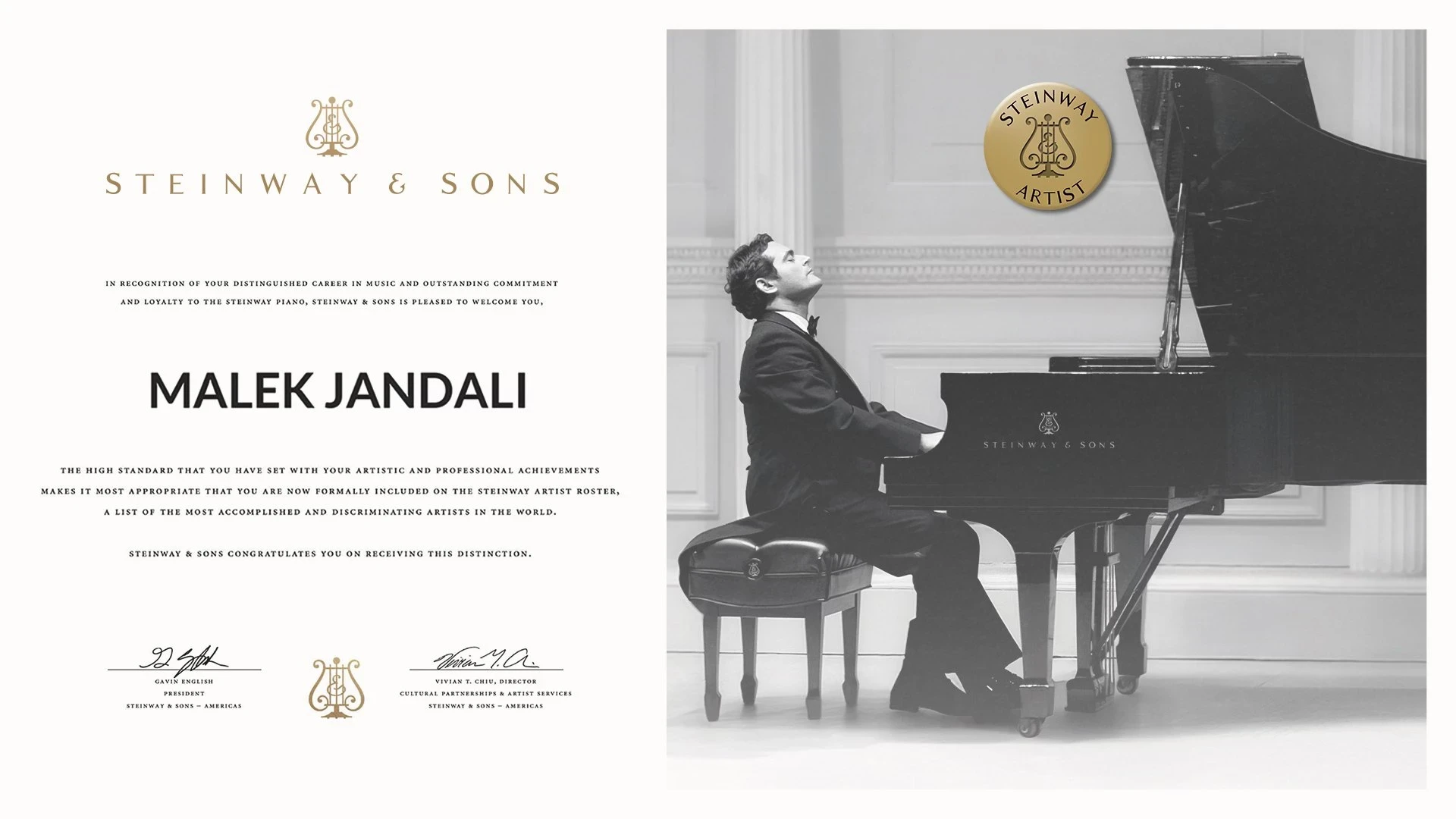 أعلنت مؤسسة Steinway & Sons اختيار المؤلف وعازف البيانو السوري الأمريكي مالك جندلي ليكون فنان شتاينواي، في إنجاز تاريخي يجعله أول فنان عربي أمريكي ينال هذا اللقب المرموق، وينضم إلى واحدة من أعرق المؤسسات الموسيقية في العالم.